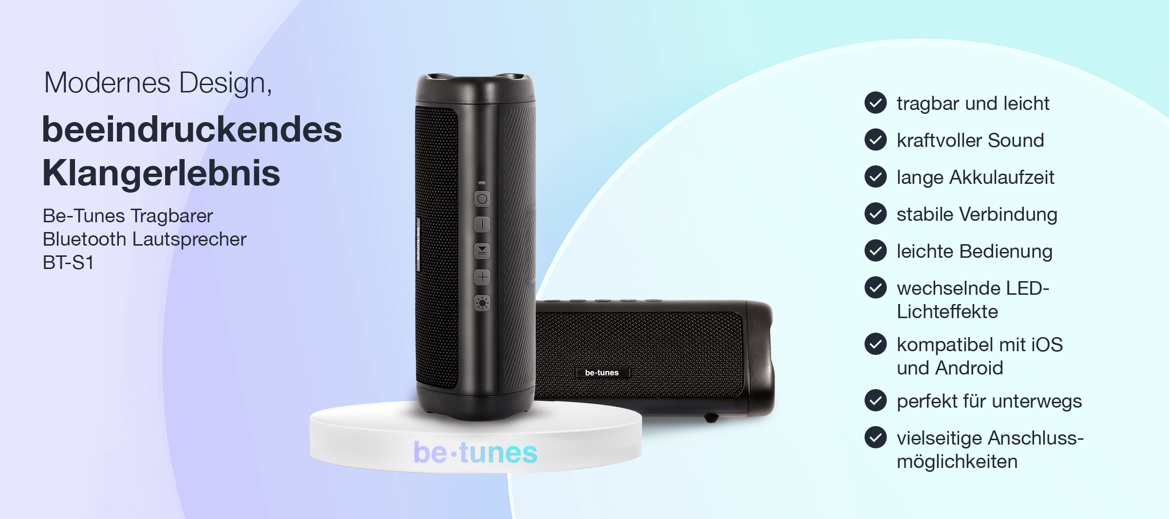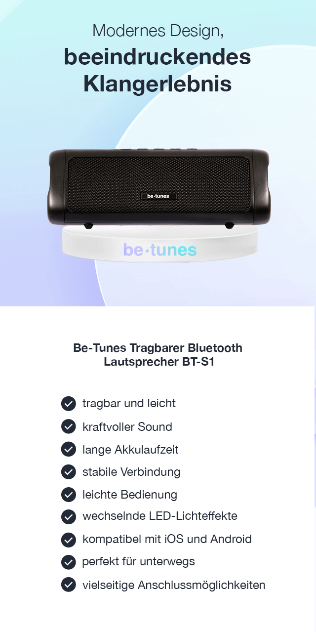 Perfekt für Partys, Ausflüge oder entspannte Stunden zu Hause – der BT-S1 Lautsprecher vereint modernes Design, praktische Features und erstklassigen Klang für jedes Event.