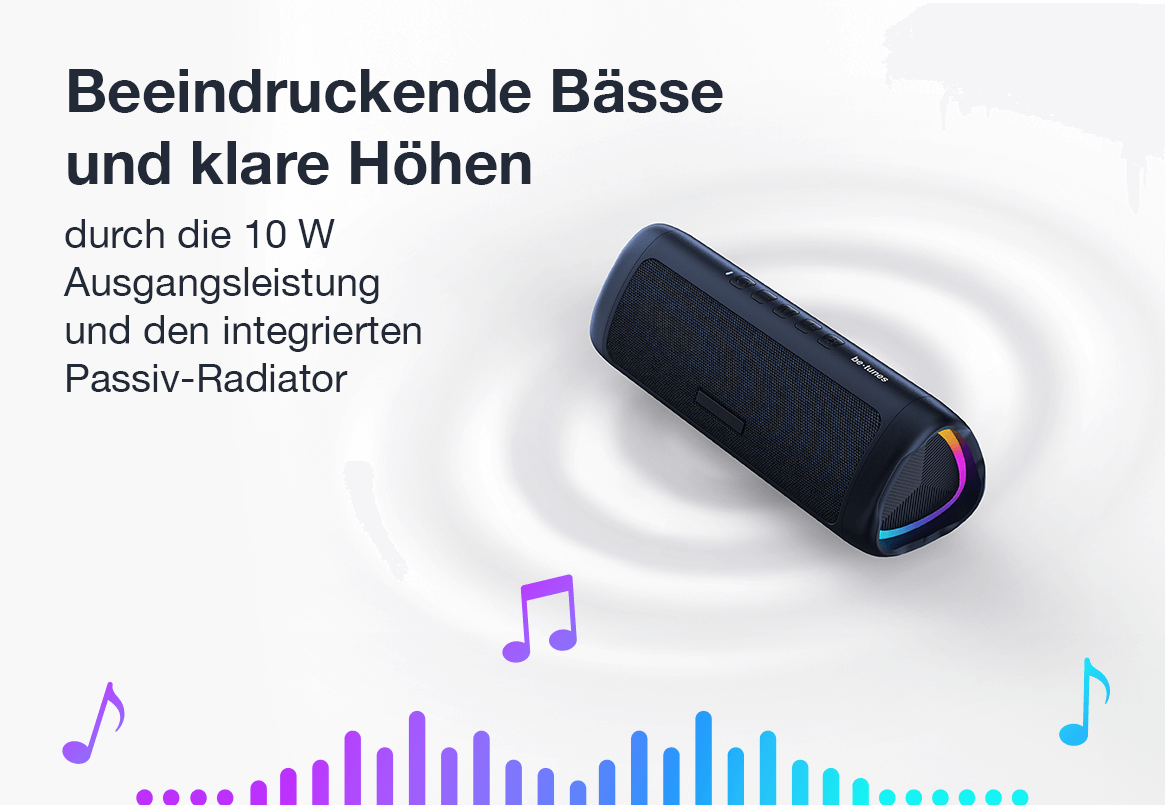 - Kraftvoller Sound: Mit einer Ausgangsleistung von 10 Watt und einem integrierten Passiv-Radiator liefert der BT-S1 beeindruckende Bässe und klare Höhen.