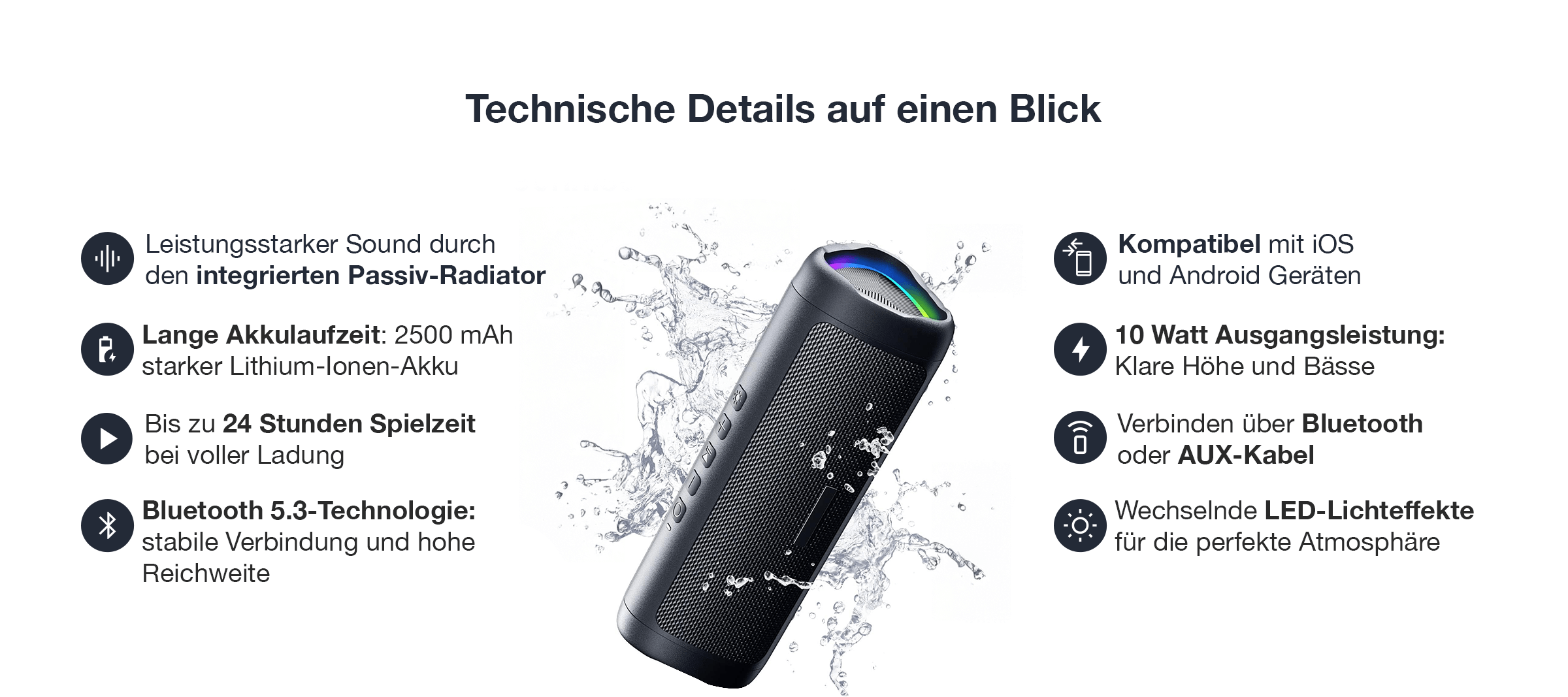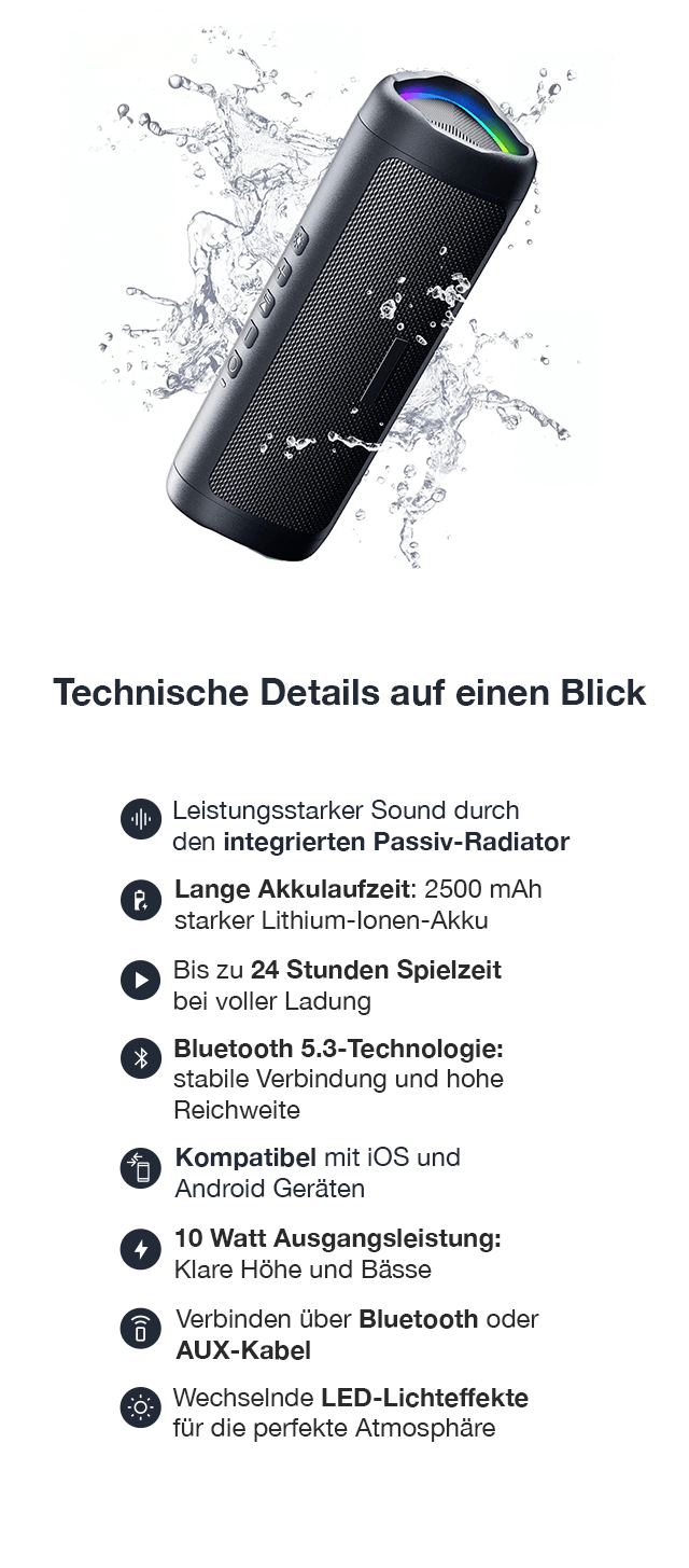 - Vielseitige Anschlussmöglichkeiten: Verbinden Sie den Lautsprecher entweder kabellos über Bluetooth oder per AUX-Kabel mit Ihrem Endgerät.