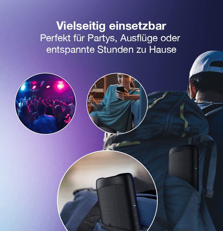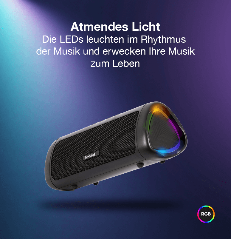 - Lichteffekte für die Party: Der Lautsprecher bietet wechselnde LED-Lichteffekte, die Ihre Musik zum Leben erwecken und die perfekte Atmosphäre schaffen.